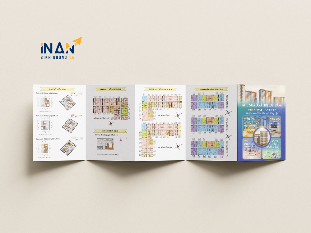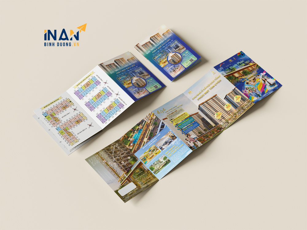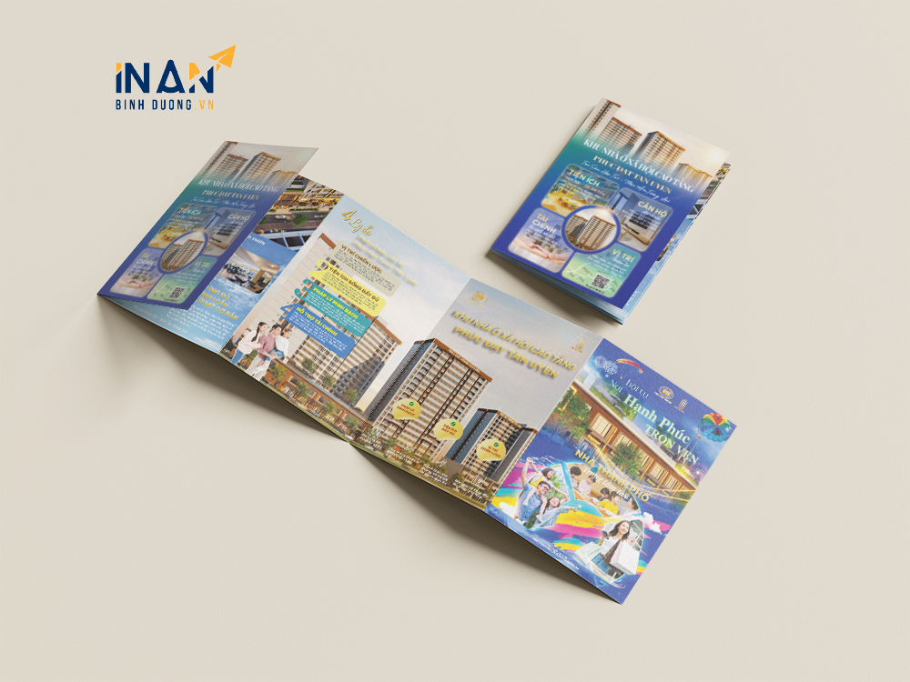 Tờ rơi gấp là một trong những ấn phẩm marketing truyền thống hiệu quả nhất trong lĩnh vực bất động sản. Trong dự án này, In Ấn Bình Dương đã thực hiện bộ tờ rơi gấp nhiều trang cho một dự án chung cư cao cấp. Sản phẩm được thiết kế hiện đại, hình ảnh sống động, bố cục tối ưu, đảm bảo truyền tải đầy đủ thông tin về tiện ích, mặt bằng, chính sách bán hàng và các điểm nổi bật của dự án.